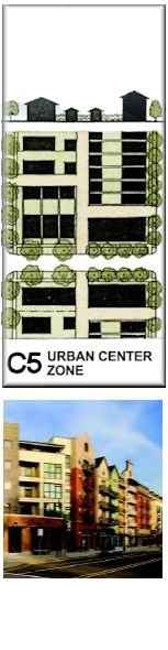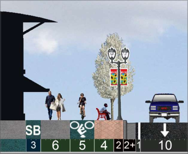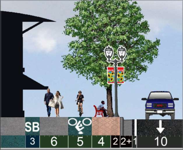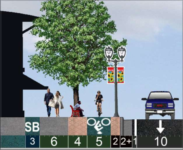 Trees: Many and large, due to Silva Cells or root trenches, but further than 10-ft from cars. Buildings: Many within 5-ft of sidewalks. Significant residential. |